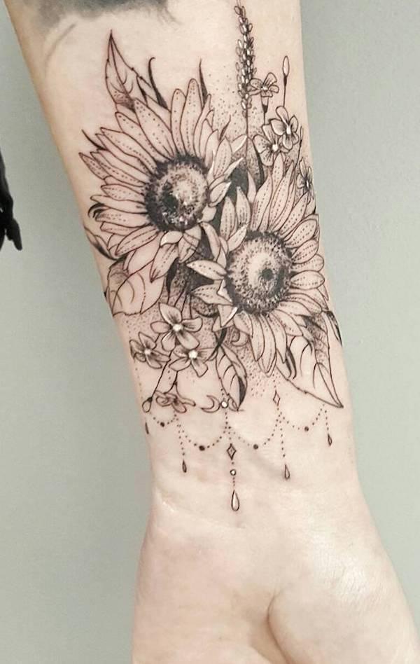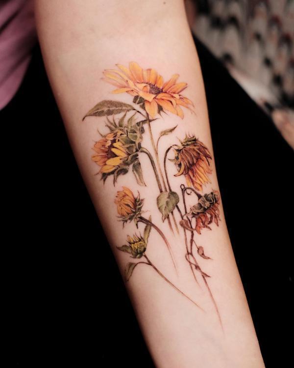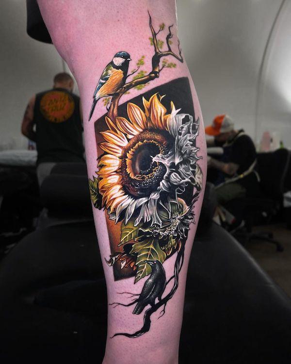 A design showcasing both wilted and vibrant sunflowers offers a compelling exploration of life’s dualities. It captures the cycle of life, the inevitability of change, and the beauty found in every stage of existence. The contrast between the decaying and blooming sunflowers adds depth and intrigue to the tattoo.