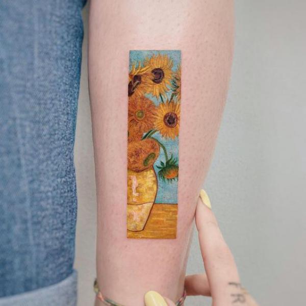 Carry a piece of Van Gogh’s genius on your skin with a rectangular tattoo featuring the iconic “Sunflowers” painting. The vibrant yellow petals and expressive brushstrokes capture the essence of this masterpiece, making it a standout tattoo that’s sure to turn heads.