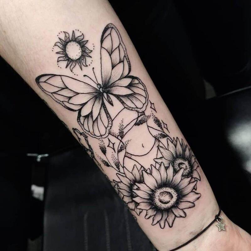 A black and white sunflower alongside a butterfly creates a stunning and symbolic tattoo design. The monochrome palette adds an elegant, timeless touch, while the butterfly represents transformation and renewal, imbuing the piece with deep meaning.