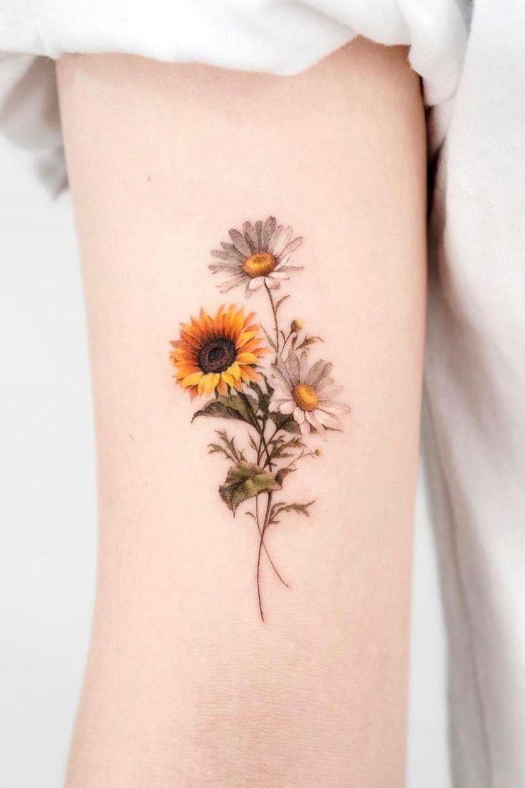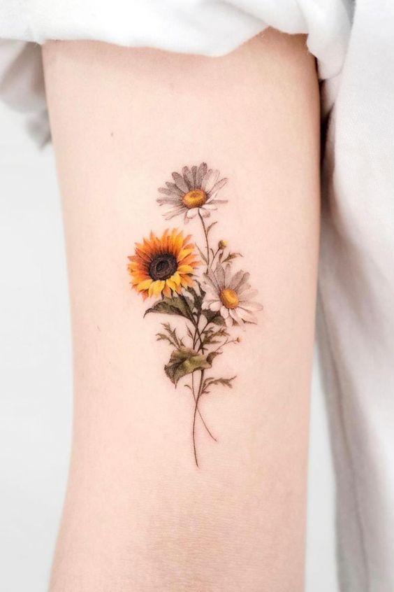 A bouquet of daisies and sunflowers is a vibrant tattoo celebrating the joy and positivity of nature.