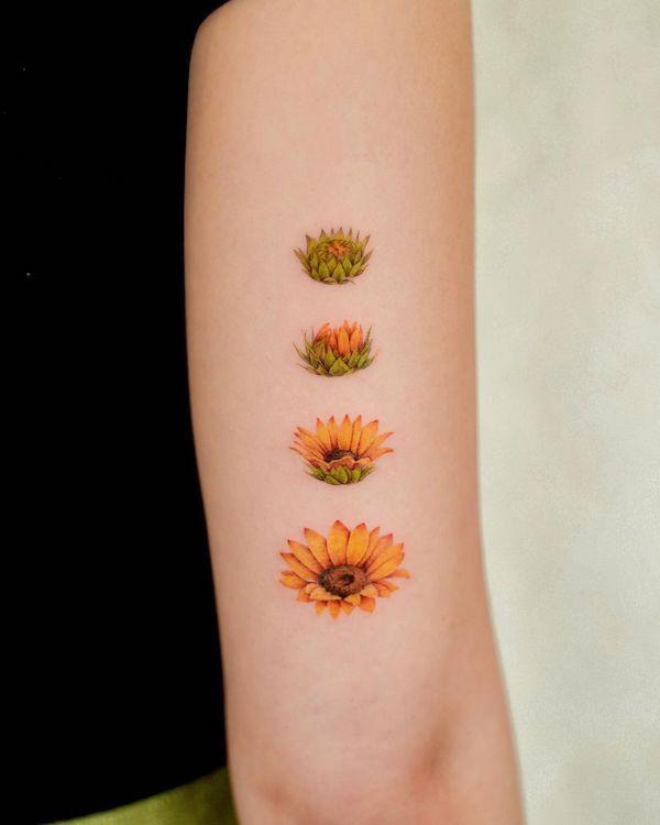 This sleeve tattoo showcases four sunflowers in various stages of growth, from bud to full bloom. It beautifully represents the life cycle, symbolizing themes of growth and transformation.