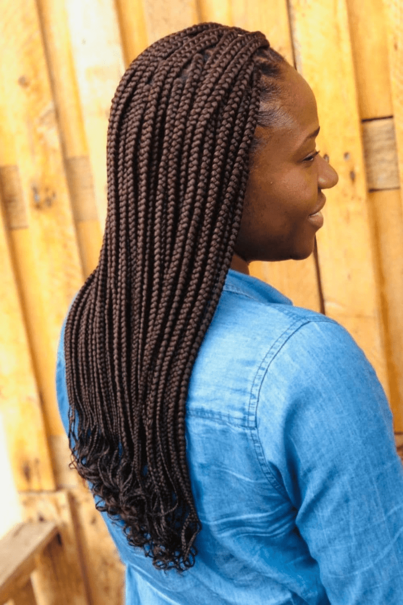 A shoulder-length box braid hairstyle with curly ends is both stylish and low-maintenance. Its manageable length and attractive texture make it a favored choice.