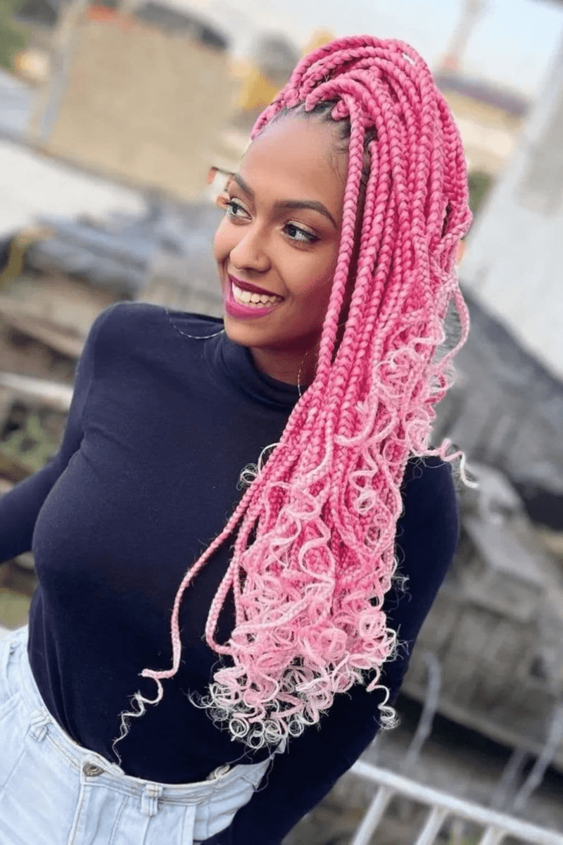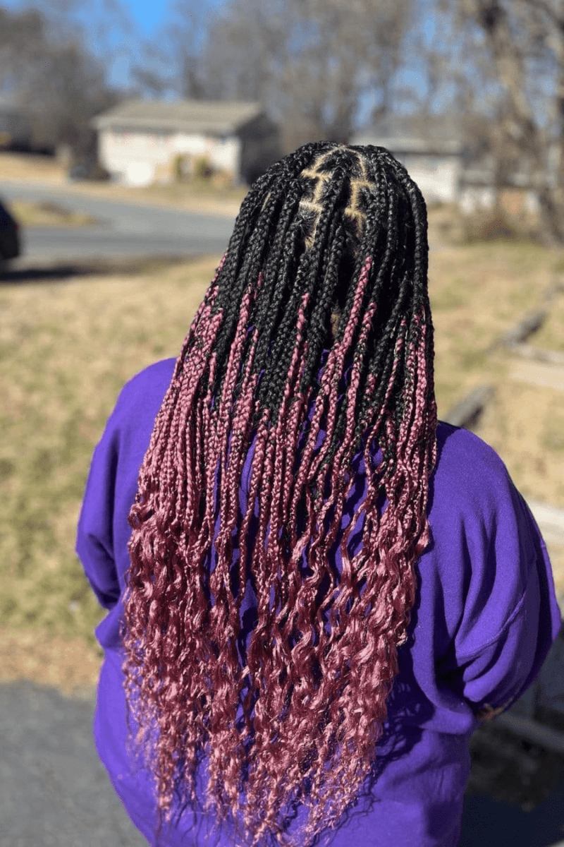 Add a touch of creativity to your box braids by incorporating a two-toned color scheme with curly ends. This blend of colors and textures infuses your hairstyle with a playful and imaginative flair.