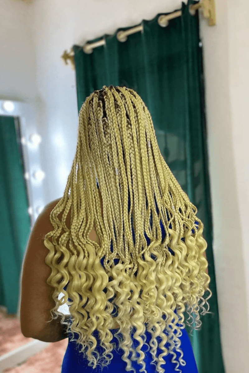Revamp your style with blonde box braids and curly ends. This trendy blend of color and texture is sure to turn heads wherever you go.