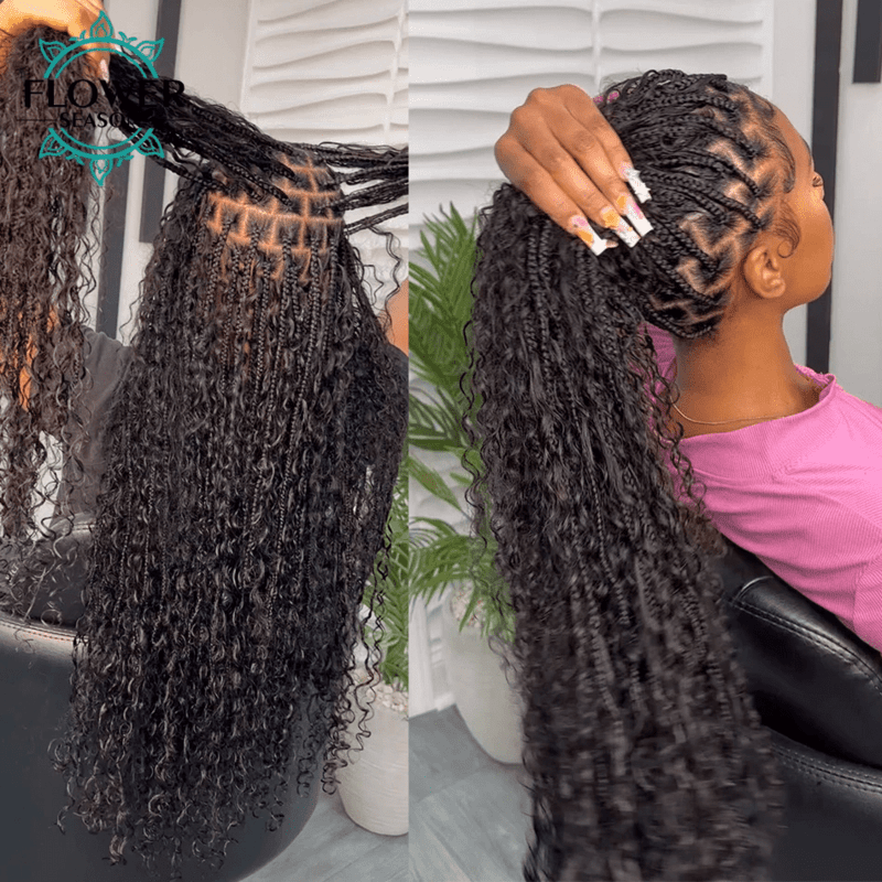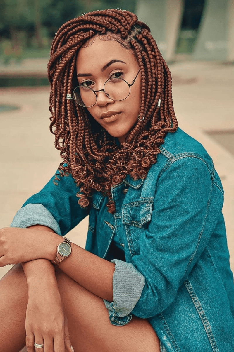 Boho box braids with curly ends exude a free-spirited vibe with their loose, wavy texture. This style is ideal for those seeking a relaxed, carefree look.