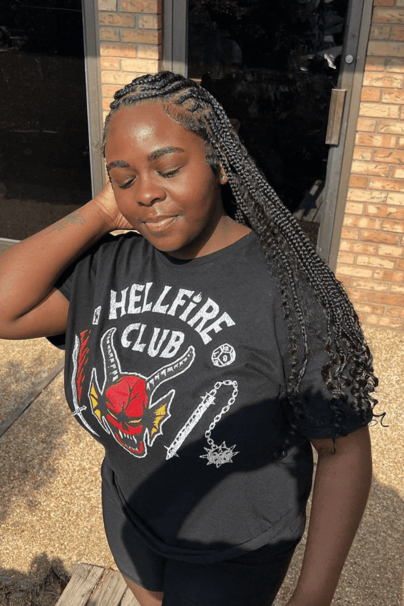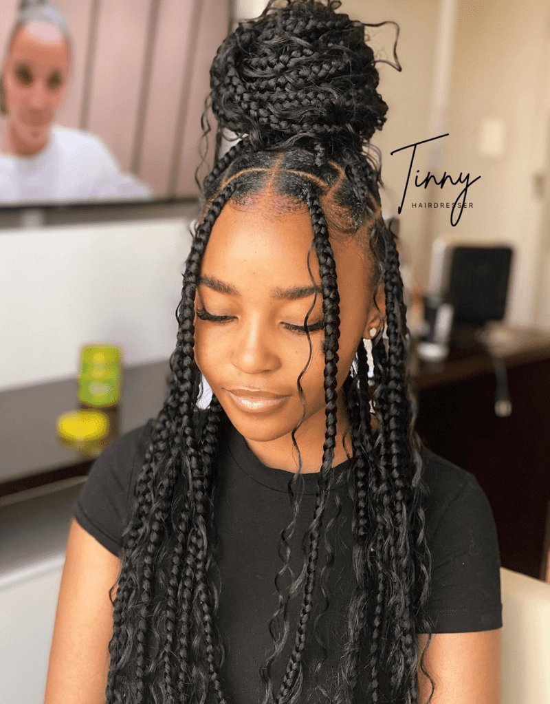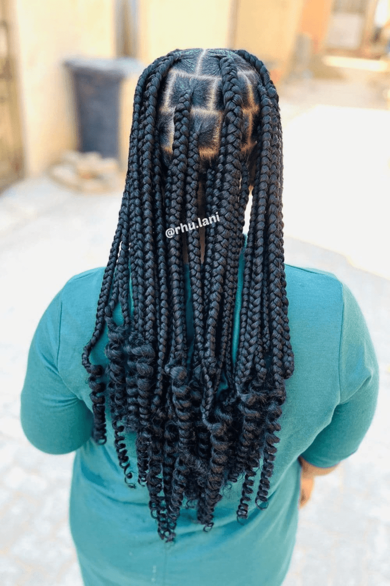 Jumbo box braids with curly ends make a powerful statement. The combination of oversized braids and curly ends creates a bold and eye-catching appearance that’s hard to miss.