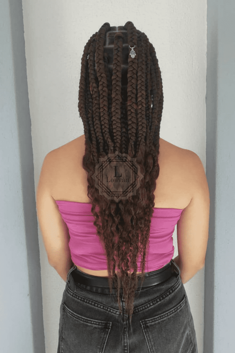 Thick box braids with curly ends deliver a bold and striking look. The substantial size of the braids enhances the dramatic effect, while the curly ends add a touch of elegance.