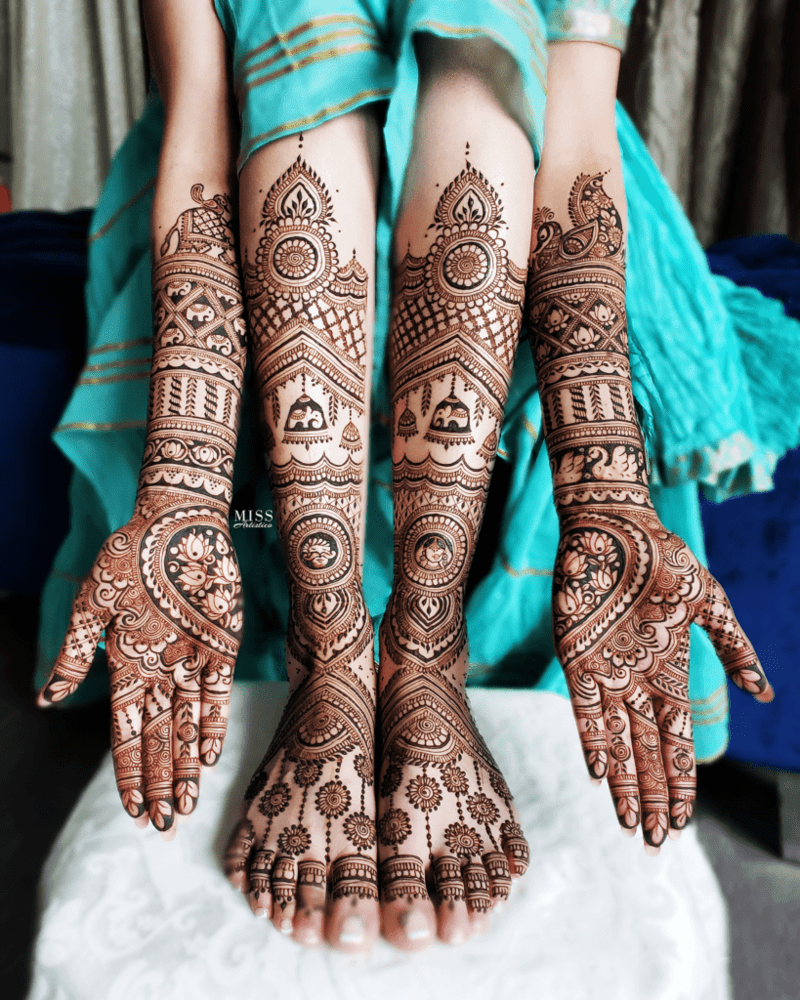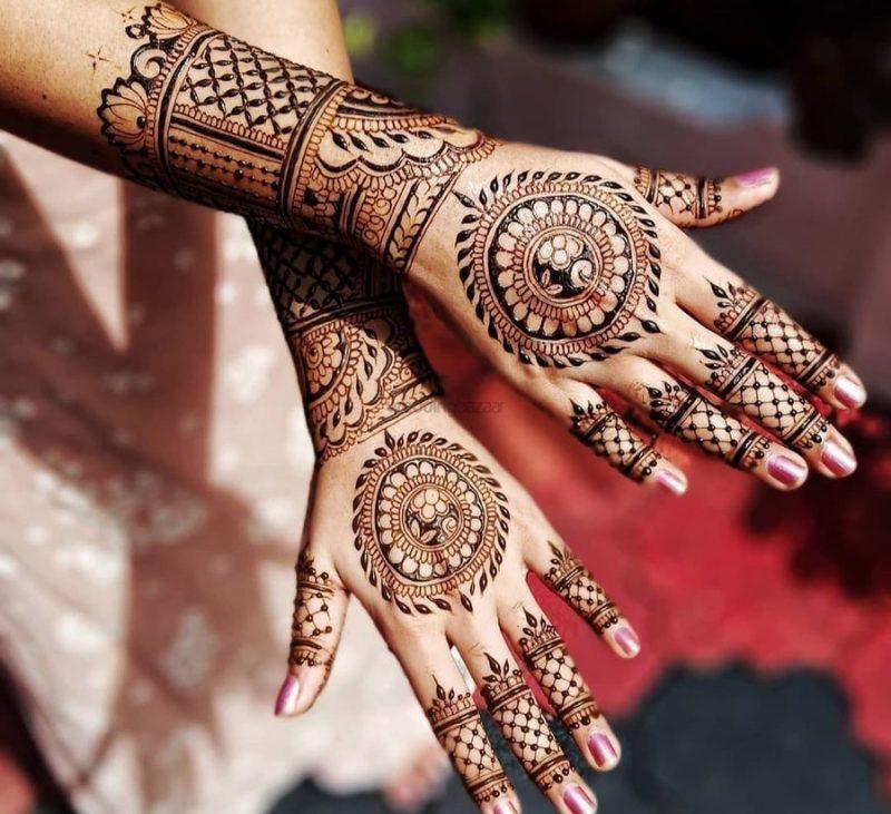 Mandalas stand out as prevalent symbols in wedding henna designs, with the term translating to “circle” in Sanskrit, symbolizing unity and wholeness. In this instance, the incorporation of a fishnet-like pattern on the fingers imparts a sultry, gloved appearance to the bride’s overall design.