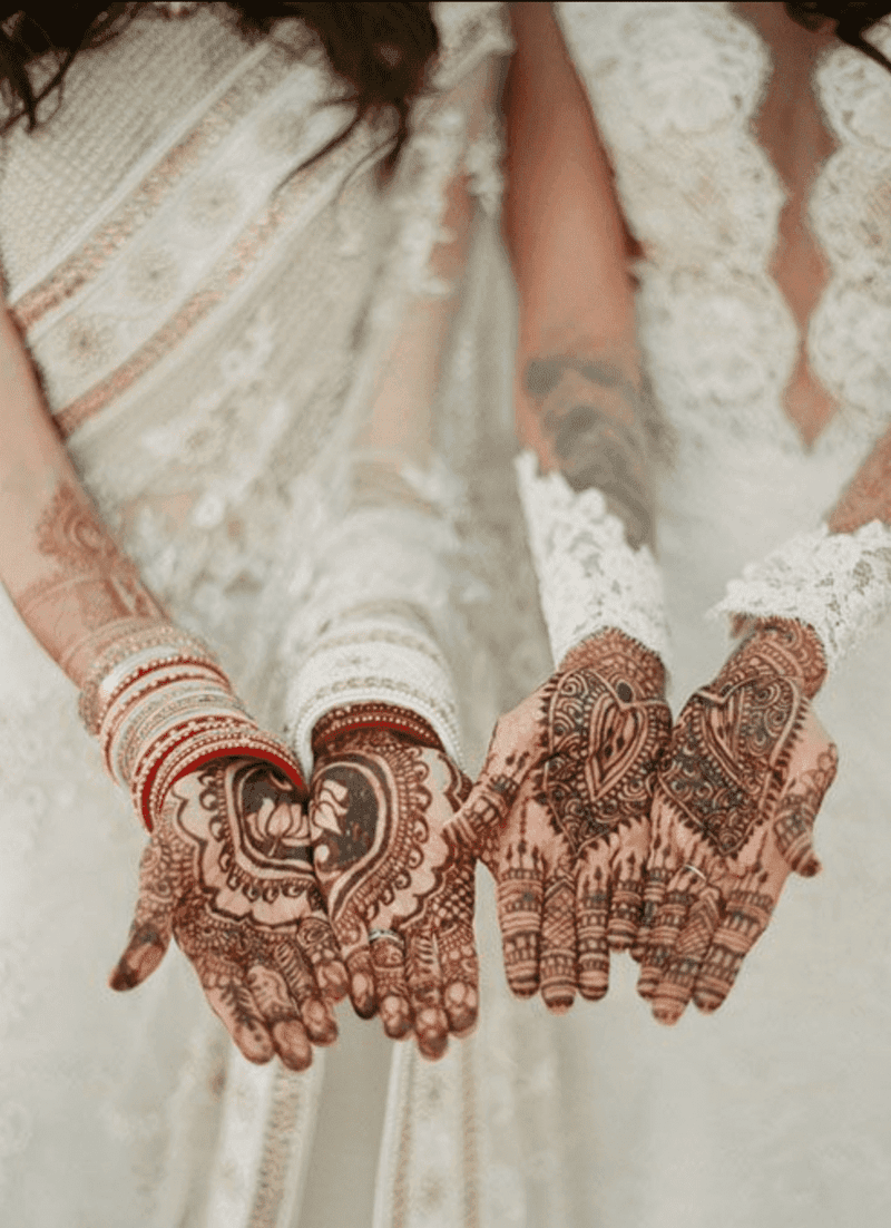 Certain brides choose henna designs that serve as a bold fashion statement. The mehndi art on this bride, done ahead of her modern Indian wedding in Los Cabos, Mexico, takes on the appearance of a stylish glove. Featuring netted detailing on the fingers and scalloped edges resembling lace trim on the wrists, it exudes a chic and fashionable look.