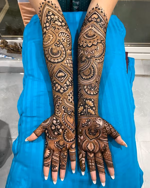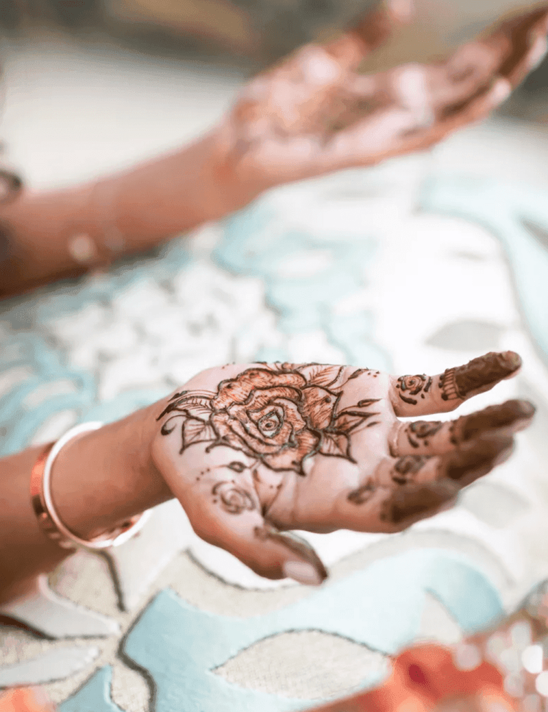Opting to showcase henna art from your fingertips to your elbows is a visually striking decision for your design. During this multi-day Indian wedding in Mexico, the bride ensured the inclusion of the classic mandala along with other intricate elements such as flowers and swirls.