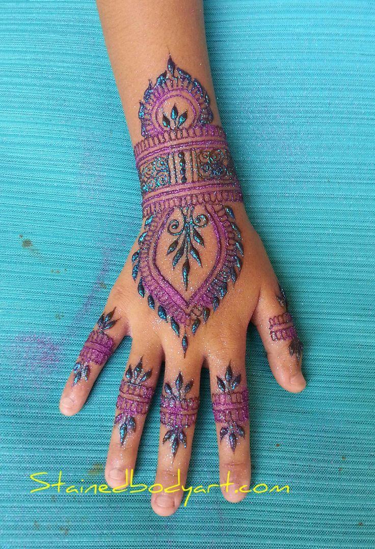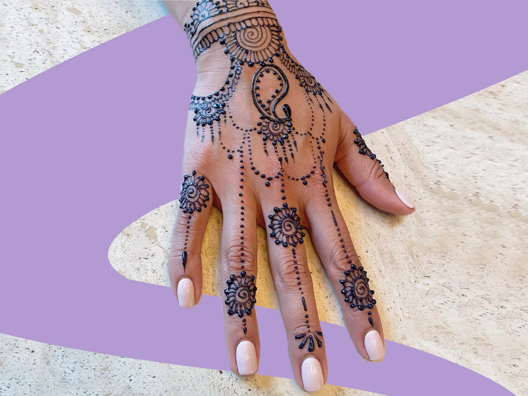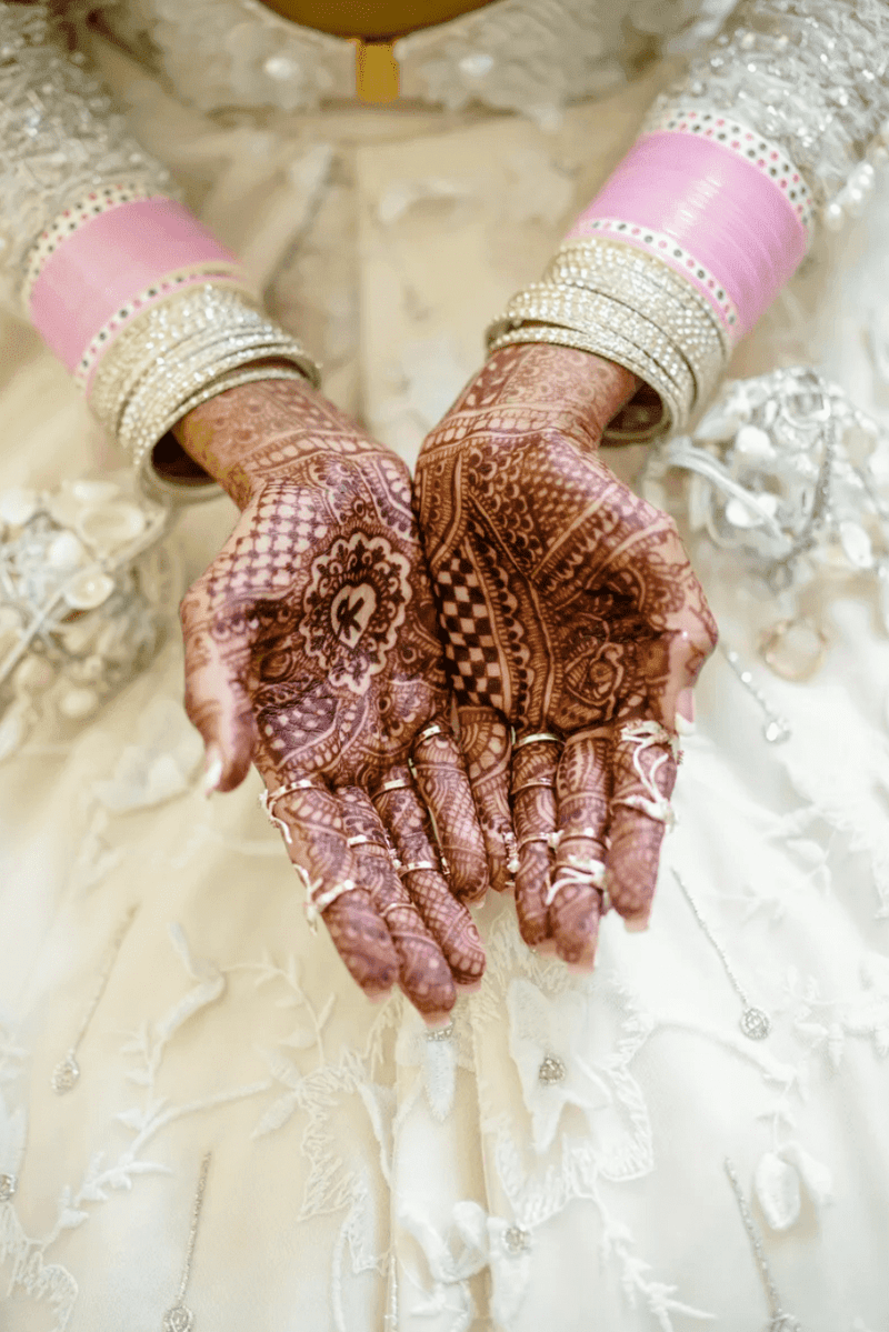 Henna designs typically come in the colors of white, red, black, or gold, but you have the option to choose another captivating hue. Ahead of her Jewish-Pakistani wedding, this bride opted for mehndi art in a vibrant purple shade, perfectly complementing her beaded frock. The artwork showcased a intricate design of mandalas, lace details, and alternating bands.