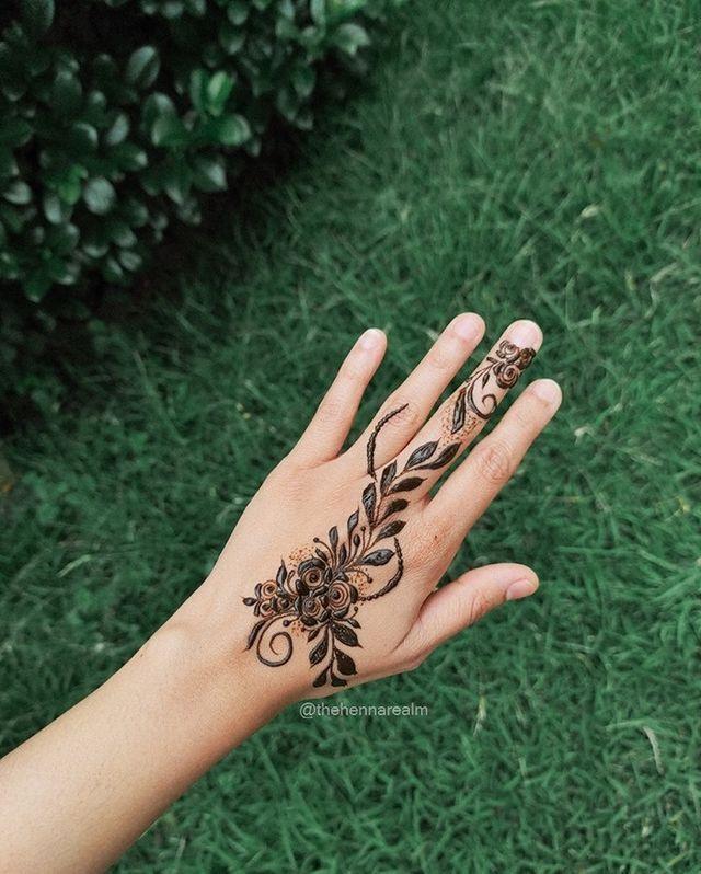 Arabic henna designs encompass uncomplicated yet swift and captivating mehndi patterns. This lovely hand design incorporates mehndi elements like leaves, flowers, and paisley, making it an ideal choice for beginners to experiment with.