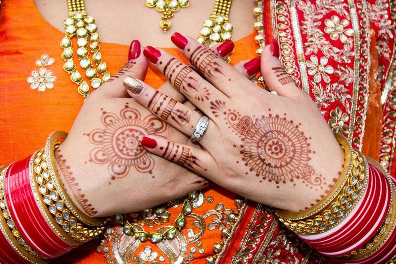 The delicate lacework of this bride’s mehndi art beautifully echoed the patterns on her vibrant, buttercup-hued sari, worn during her Hindu ceremony. The artistic details also complemented the lace embroidery on the dress she chose for her lakeside nuptials in New York. If multiple outfit changes are on the agenda for your big day, we recommend selecting a henna design that harmonizes with all of your ensembles.