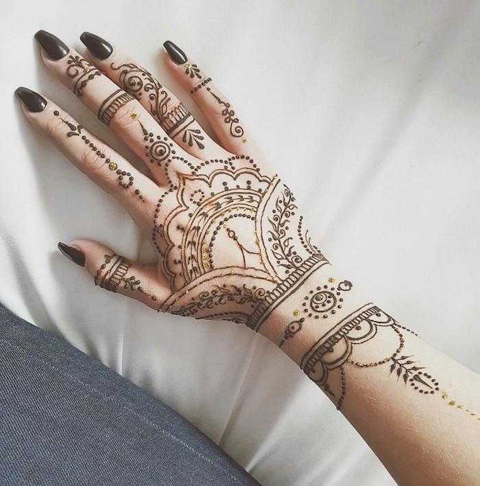 Certainly, choosing details and symbols that reflect your identity and relationship is crucial, but it’s also essential to consider how your henna designs will complement the rest of your ensemble. Take this bride, for example, who displayed an elbow-length masterpiece in red and black for her fashion-forward, bohemian wedding. She opted for nude polish on her fingernails to ensure that the artwork didn’t overshadow her nails.