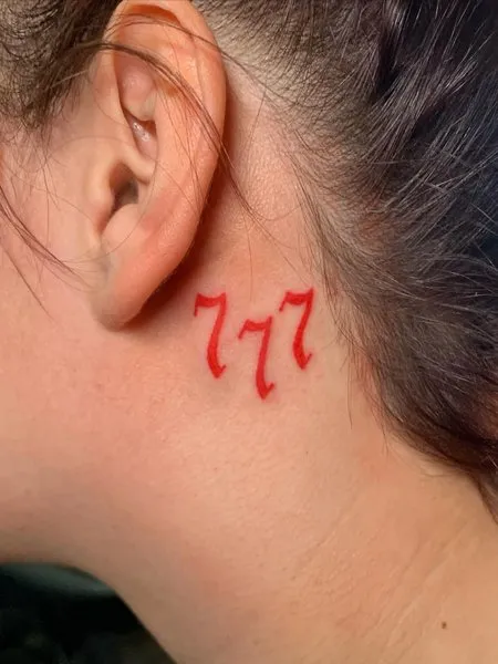 777 tattoos symbolize good luck and fortune, commonly placed on the back of the neck, behind the ear, or on the wrist. These tattoos can be designed in various styles, often featuring three sevens, seven sevens, or the number 777 written out. In many cultures and religions, these numbers represent luck, love, and faithfulness.