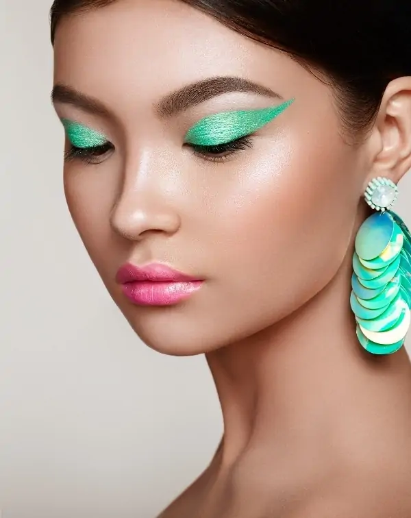 This pop of light green paired with playful pink creates a vibrant and eye-catching look! Surprisingly, this unexpected color combination works beautifully in an eye makeup style like this.