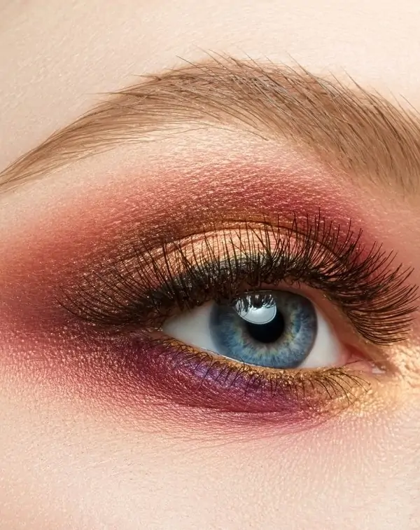 For this particular style, shades of reddish tones, coral, pinkish purple, and gold come together beautifully. The striking combination of coral and orangish-gold provides a captivating contrast that truly enhances blue eyes!