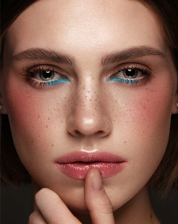 Start by tracing your inner lower lash line with a bright, vibrant metallic blue, leaving the outer third clean and concentrating the color on the inner portion for a striking effect. You can either dampen your brush before dipping it into the eyeshadow or use a cream eyeshadow for a similar result.