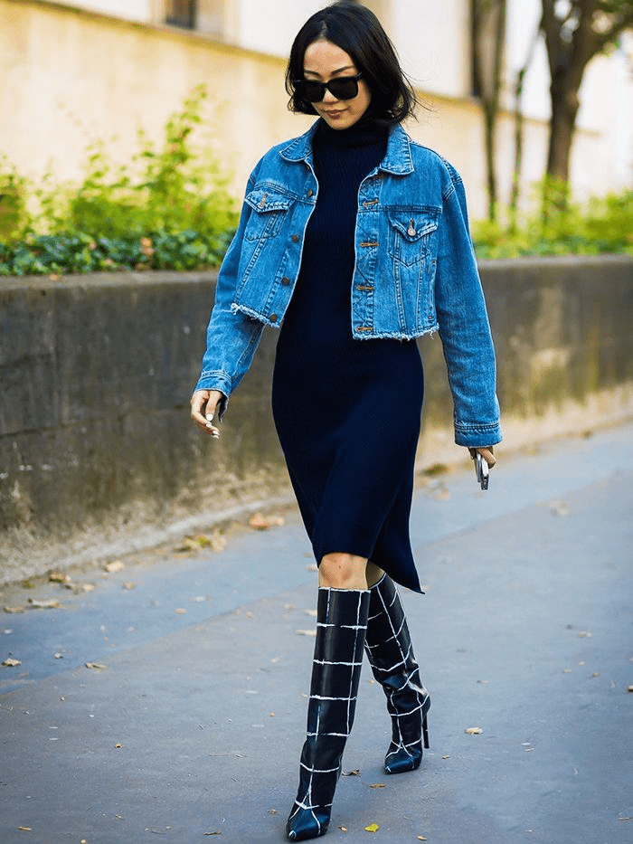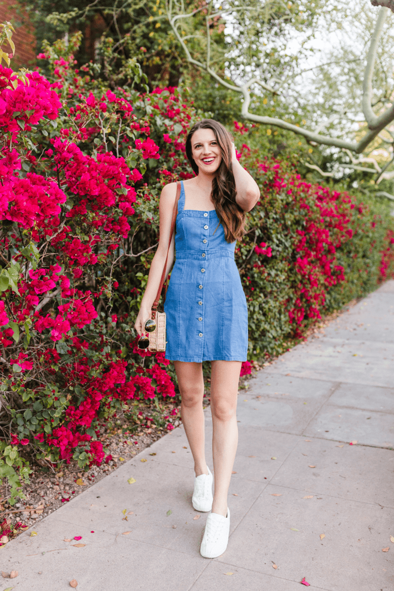 A MIDI DRESS, SNEAKERS, AND A DENIM JACKET