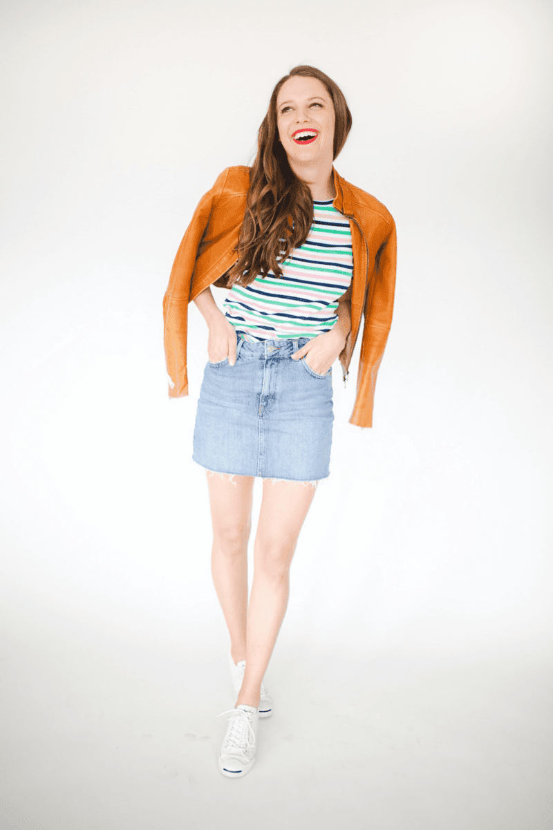 STRIPED TEE, JEAN SKIRT, LEATHER JACKET, SNEAKERS