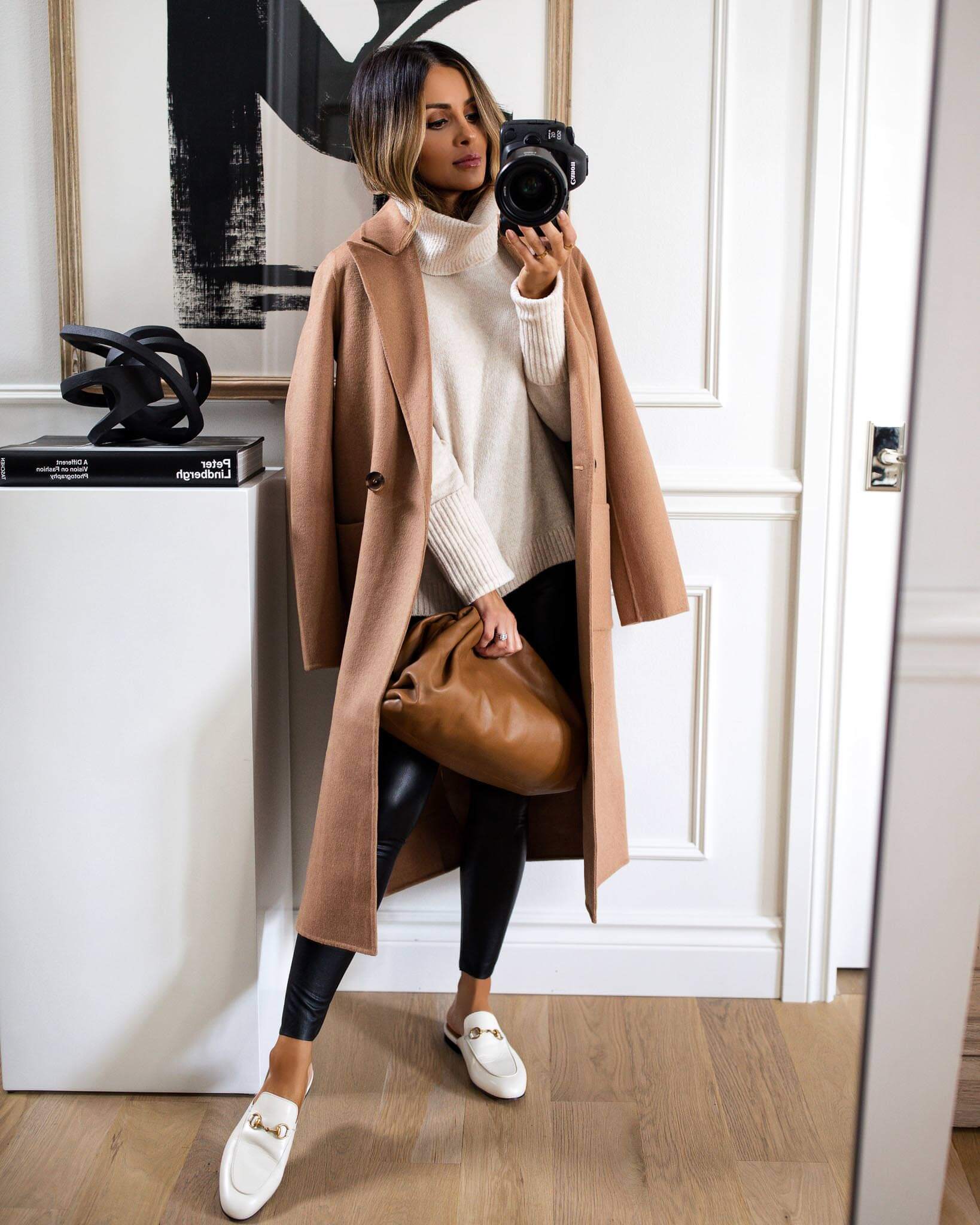 CAMEL COAT, TURTLENECK SWEATER & MULE LOAFERS