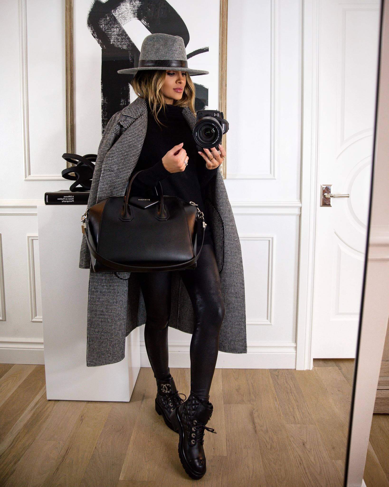 I love styling all-black outfits with my faux leather leggings, and one of my go-to tricks for keeping them fresh is adding a jacket in a different color. This look has plenty of leather, but the blue-gray jacket softens the overall vibe. It’s the perfect outfit for a stylish weekend.