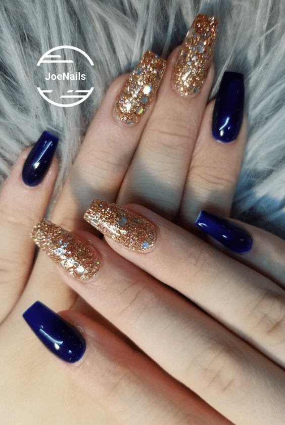 SQUARE SHAPED NAVY BLUE NAILS WITH GOLDEN GLITTER