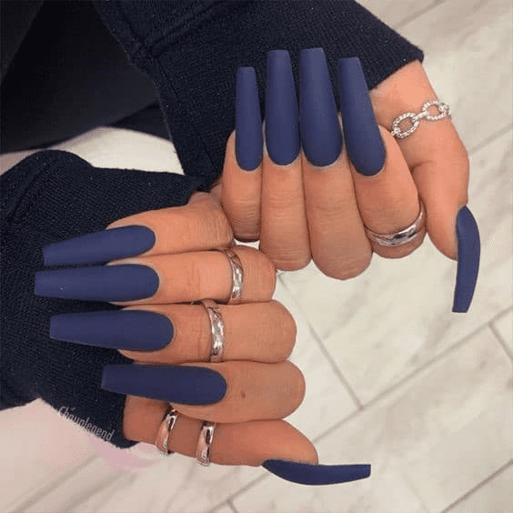 For those who crave drama and attention-grabbing style, super long matte navy blue nails are the ultimate statement piece. The dramatic length elongates your fingers and creates a sleek, sharp silhouette. The matte finish adds a touch of modern edge and sophistication, setting them apart from glossy navy manicures. This bold look isn’t for the faint of heart – the length might hinder daily tasks. But for special occasions or those who embrace a fashion-forward style, super long matte navy blue nails are guaranteed to turn heads and leave a lasting impression.