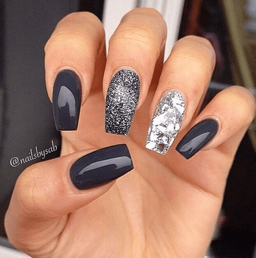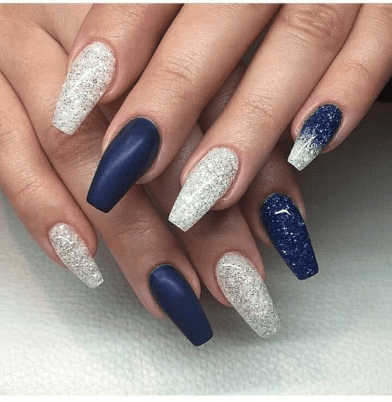 Strike a balance between classic and eye-catching with square shaped navy blue nails featuring a pop of glitter. The sharp edges of the square shape create a modern and polished look, while the navy blue adds a touch of sophistication. To add a playful twist, incorporate glitter in a few ways. You could have an accent nail completely covered in a contrasting glitter polish, or for a subtler touch, add a delicate glitter stripe down the center of one or two nails. This way, you can enjoy the elegance of the navy blue with a hint of sparkle that catches the light for a truly unique and dazzling manicure.