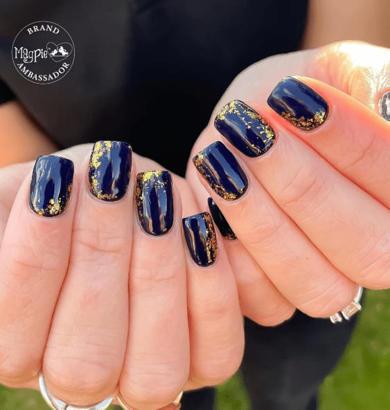 Embrace a touch of luxury with square shaped navy blue nails accented by golden glitter. The sharp lines of the square shape create a modern and polished foundation, while the deep navy blue adds a touch of sophisticated edge. To elevate the look, incorporate golden glitter in a way that complements your style. You could have an accent nail completely covered in a dazzling gold glitter, or for a subtler touch, add a delicate, shimmering stripe of gold glitter near the tip of each nail. This combination allows you to enjoy the timeless elegance of navy blue with a hint of glamour that catches the light, creating a truly unique and eye-catching manicure.