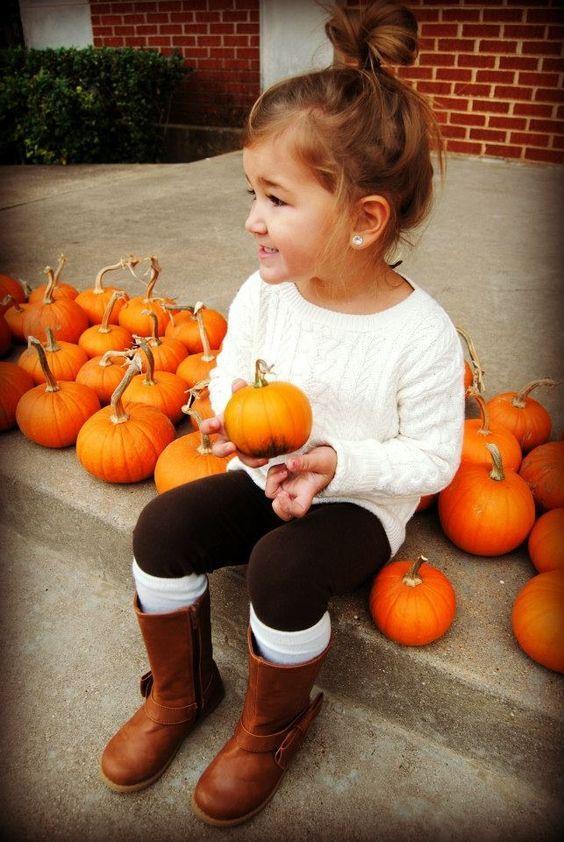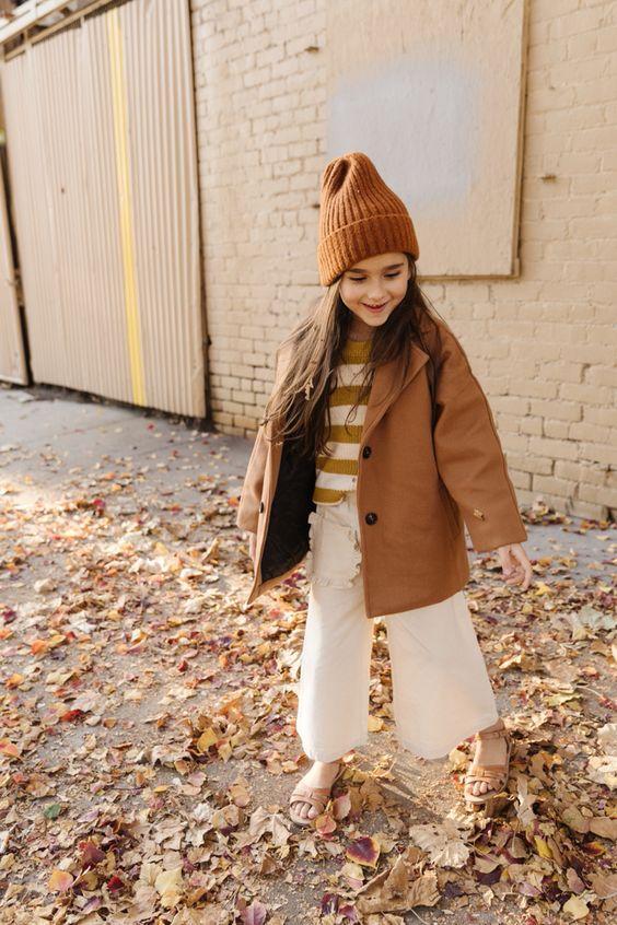 This adorable fall outfit features a warm white sweater that keeps kids cozy on chilly days. The soft, light color makes it easy to pair with different bottoms, giving it a classic look. When paired with black leggings, this outfit looks stylish and allows for easy movement during playtime. The black leggings create a modern contrast with the white sweater. To complete the look, there are trendy brown boots that not only look great but also keep little feet warm.