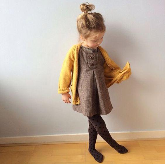 This charming fall outfit features a vintage brown dress with delightful buttons, showcasing a retro style that brings warmth and nostalgia. The rich brown color creates a cozy look, perfect for autumn days. Worn over the dress, a sunny yellow cardigan brightens the ensemble, introducing a cheerful pop of color that captures the spirit of the season. This warm layer provides extra comfort as temperatures drop, ensuring your little one stays cozy.