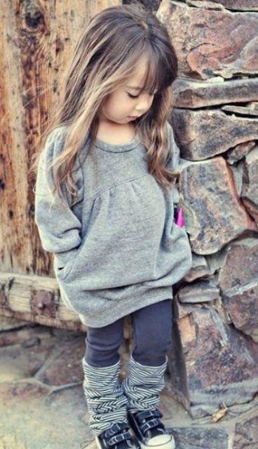A grey sweater dress provides a cozy and versatile base, while brown leggings deliver warmth and support. Striped legwarmers introduce a playful touch, and sneakers complete the look with a casual and comfortable feel. The brown leggings ensure extra warmth and support, making them perfect for outdoor play.