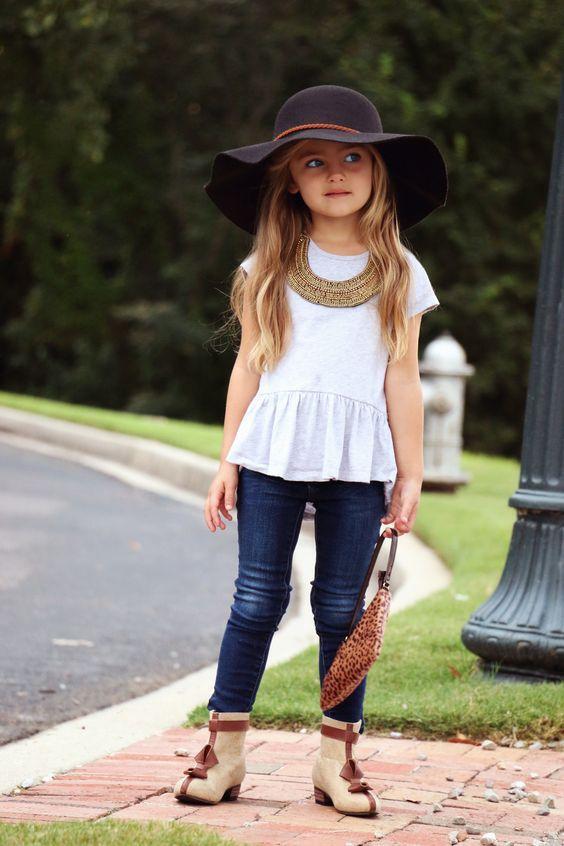 Jeans are a wardrobe staple for kids of all ages, offering both comfort and style. Boots are a great choice for fall, providing warmth and protection from the elements. A white peplum top adds a touch of sophistication and can be paired with a variety of bottoms. A hat completes the look with a casual and cool vibe, providing shade and protection from the sun.