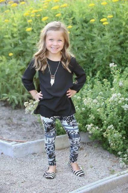 The playful patterns on the leggings create a vibrant base, perfect for kids who love to express themselves through fashion. Worn with a classic black tunic, the outfit balances the boldness of the leggings with a sleek and stylish top. The tunic’s length provides comfort and coverage, making it a practical choice for active days.