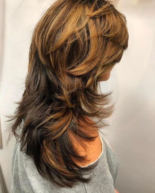 A long shag haircut that feathers down the back and flips out around the neckline and shoulders is a perfect choice for showcasing wavy hair. The two-tone color enhances the defined layers, adding depth and dimension to this chic, effortless style.