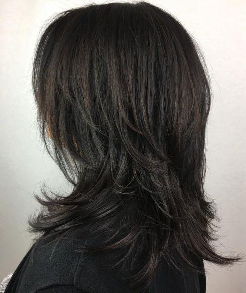 Your shag will look vibrant and shiny with long layers in the back that subtly flip up at the ends. Wispy bangs frame the face, while copper highlights provide a glossy sheen. This medium-length haircut is versatile too, easily pulled back into a ponytail while maintaining visual interest around the face.