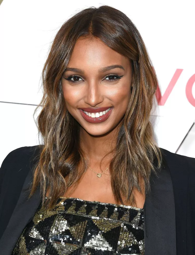 If you’re seeking a modern twist on the shag cut without the traditional bangs, look to Jasmine Tookes for inspiration. She styles her medium-length hair with soft bends and tucks it behind her ear for a chic and effortless look.