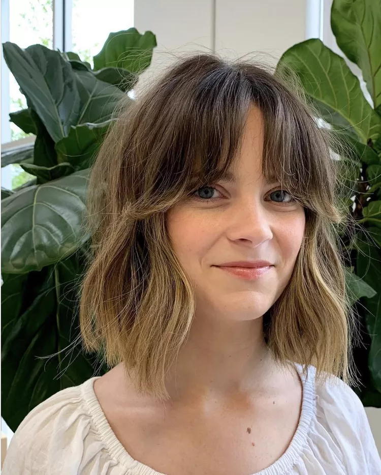 There’s a compelling argument for Lily Collins being the ultimate queen of fringe. In this look, her wispy, choppy bangs beautifully complement a loosely waved shag, creating a effortlessly chic style.