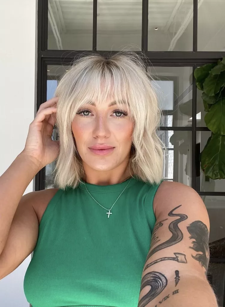 This blonde shag features blunt ends that graze just above the shoulders, while soft layers throughout the cut introduce texture and movement, giving the style a modern edge.