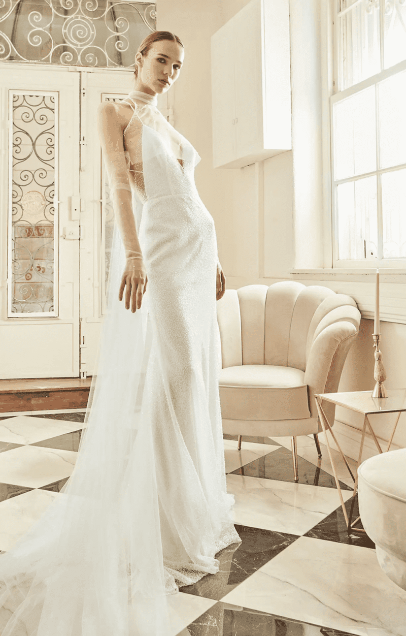 Galia Lahav’s Dakota gown is a dazzling choice for the bride seeking a touch of Hollywood glamour on her wedding day. Inspired by Art Deco, the dress features a fitted bodice that cinches the waist and showcases intricate geometric patterns formed by sparkling glass and crystal beads. The plunging S-neckline adds a touch of sophistication, while illusion tulle sleeves adorned with similar beadwork offer a touch of vintage charm. The real showstopper is the skirt. Crafted from luxurious tulle, it cascades outwards in a trumpet silhouette, creating a dramatic silhouette that flows effortlessly into a long train. This combination of exquisite beadwork, a flattering bodice, and a voluminous skirt makes the Dakota gown a perfect choice for the bride who wants to make a grand entrance and feel like a star on her special day.