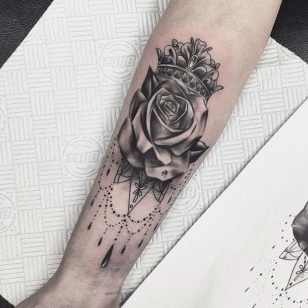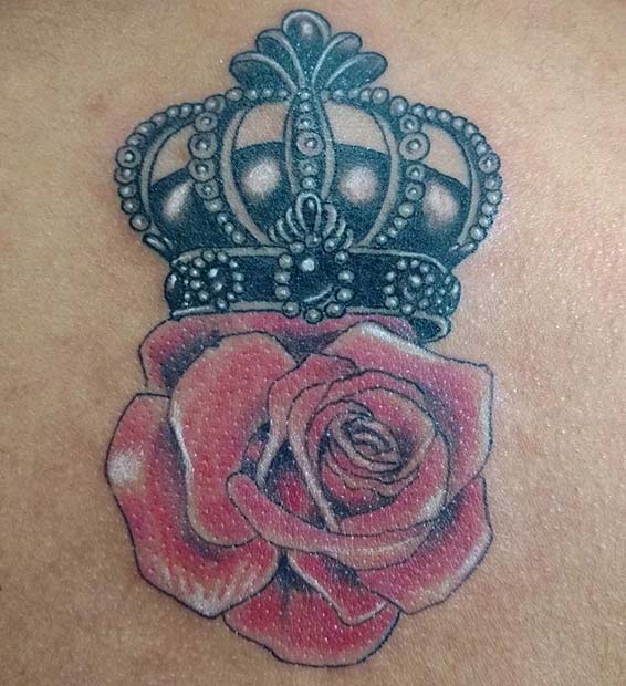 Pair a vibrant red rose with a black ink crown for a bold, stylish tattoo. This combination works great on the arm and can be enhanced with added color or intricate details.