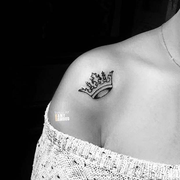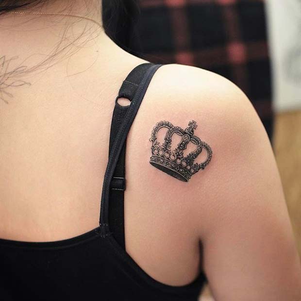 A simple black ink crown on the shoulder is both chic and versatile. It can also be placed on other areas like the wrist, ankle, or foot for a similar effect.