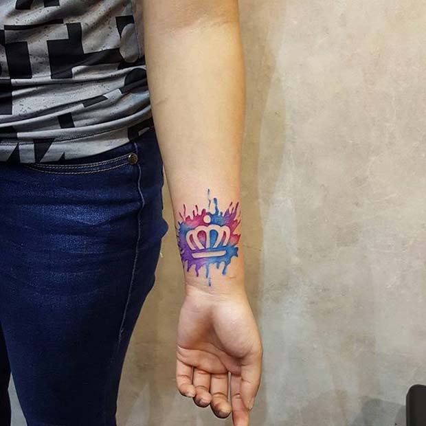 A colorful watercolor crown tattoo offers a playful and artistic aesthetic. Customize it with your favorite shades to make the design uniquely yours.