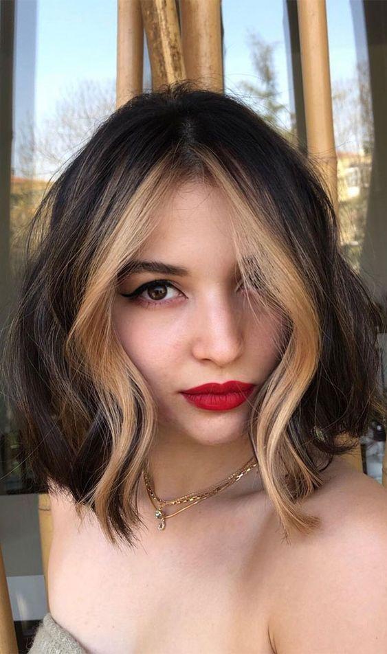 Black hair with blonde front pieces is a stylish look that mixes deep black hair with bright blonde highlights at the front. This contrast creates a beautiful effect, adding a touch of golden light around the face. The blonde highlights can be softly blended into the black hair or placed more clearly at the front to frame the face. This combination of dark black hair with vibrant blonde pieces adds depth and dimension to the overall look.