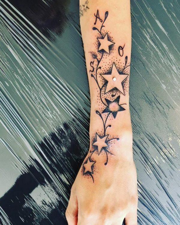 Wrist tattoos have gained immense popularity, as demonstrated by our next idea showcasing the stylish appearance of stars as a wrist tattoo. Four small stars, inked in black, form a line on the wrist in this design. You can replicate a similar pattern with a different number of stars or experiment with alternative colors for a personalized touch.