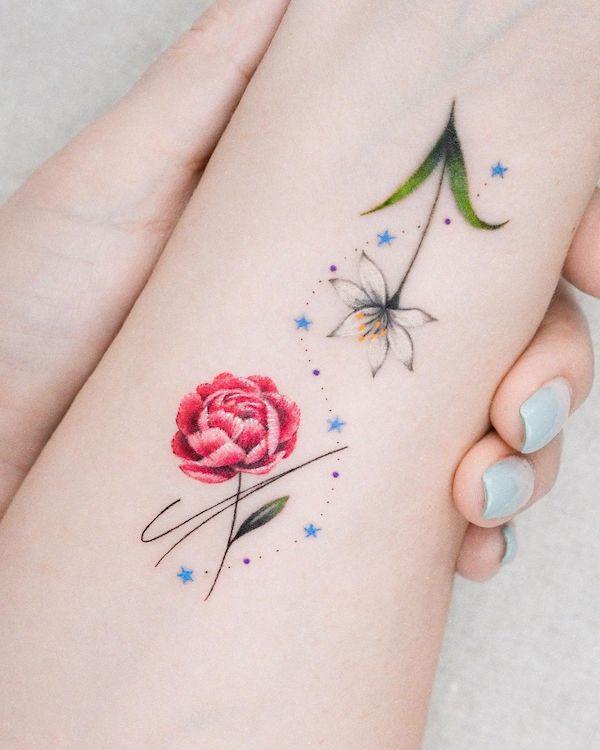 Presenting the next idea, an arm tattoo adorned with stars and a flower. This quirky and stylish tattoo adds a cute touch that suits anyone. Feel free to replicate this design or consider incorporating a different flower – your birth flower could be a cool choice. Adding some color to the mix would further enhance the overall aesthetic.