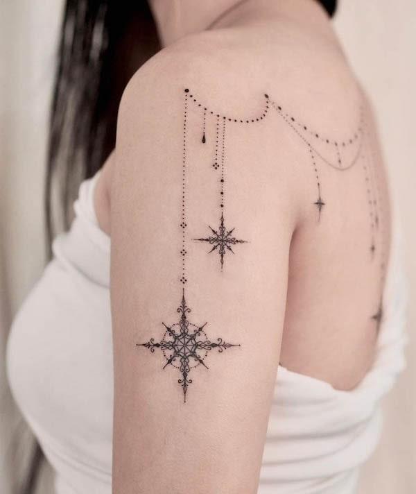 This following tattoo concept is truly captivating! Comprising small stars and dots meticulously arranged to form a larger star shape, some of these stars are adorned with vibrant ink. These women’s feminine star tattoos would enhance the beauty of anyone who chooses it. For a more subtle approach, you can opt for a smaller version of the design and have it placed on a different area of your body.