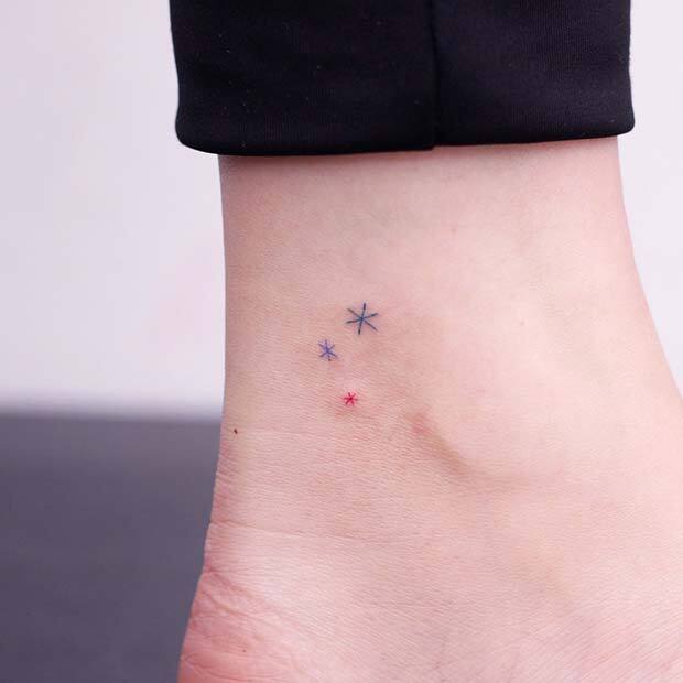 For those seeking an extremely subtle tattoo, the next option could be an ideal choice. This ankle tattoo consists of three minuscule stars inked in vibrant colors. Its petite size makes it a perfect option for a first tattoo. You have the flexibility to choose any color that resonates with you.