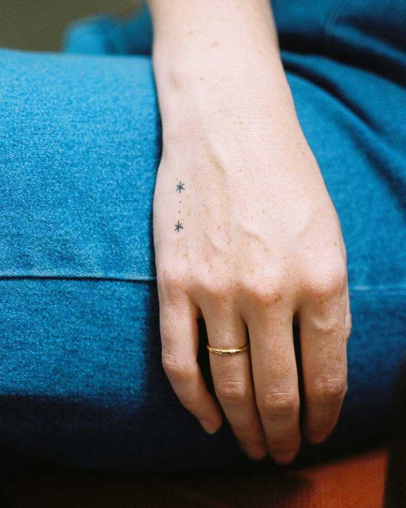For those seeking a small and stylish tattoo, look no further. This design showcases three petite stars delicately inked near the wrist. A beautiful tattoo idea, it offers versatility as it can be placed anywhere on the body. Its diminutive size makes it an ideal choice for a first tattoo, and you have the option to replicate this design or experiment with a different number of stars to suit your preference.